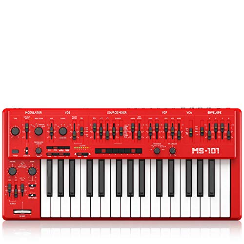 Behringer MS-101-RD analog synthesizer with 32 full-size keys, 3340 VCO with 4 simultaneous waveforms, vcf, ADSR, 32-Step sequencer, arpeggiator and live performance kit.