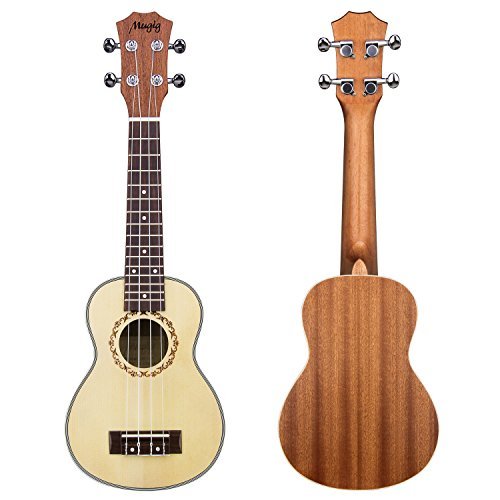 Mugig Ukulele,Soprano Ukulele 21 Inch, 4 Nylon Strings, Spruce Top, Panel Hickory Fretboard, Silver Geared Tuners Instrument with Black Carry bag