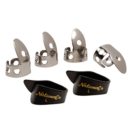 National picks have been popular for generations due to their style and durability. This package of National picks brings together 4 stainless steel fingerpicks and 2 thumb picks made of ABS to meet the dual needs of many musicians.