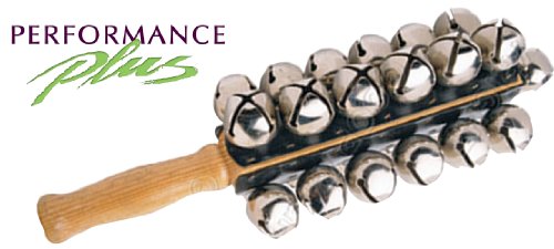 The Performance Plus SBL-25 Deluxe hand-held Sleigh Bell has 25 highly polished nickel plated medium/large bells. Deluxe quality 4 Rows of 6 Bells plus one on top mounted on a one piece hardwood maple stick and handle. Protective strips attached to the back. Bright, clear crisp jingle bell tone. For Latin, African, Ethnic and Christmas Rhythms.
