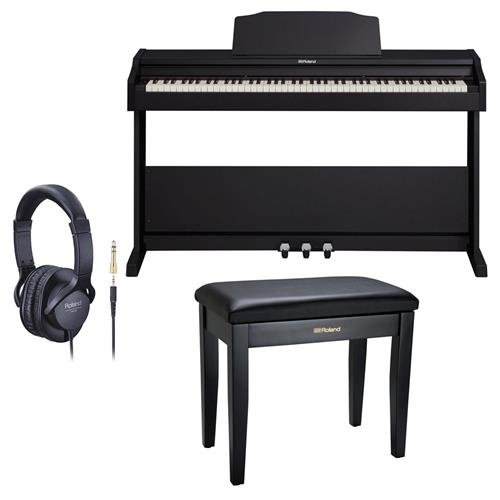 Roland RP-102 88 Key Digital Piano, Black – Bundle With Roland Piano Bench with Cushioned Seat and Storage Compartment Satin Black, Roland RH-5 Around-Ear Stereo Headphone with Conversion Plug