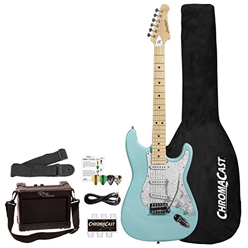 Sawtooth 6 String Right Handed Electric Guitar With Pickguard, Daphne Blue/Pearloid White (ST-ES-DBLP-BEG-KIT)