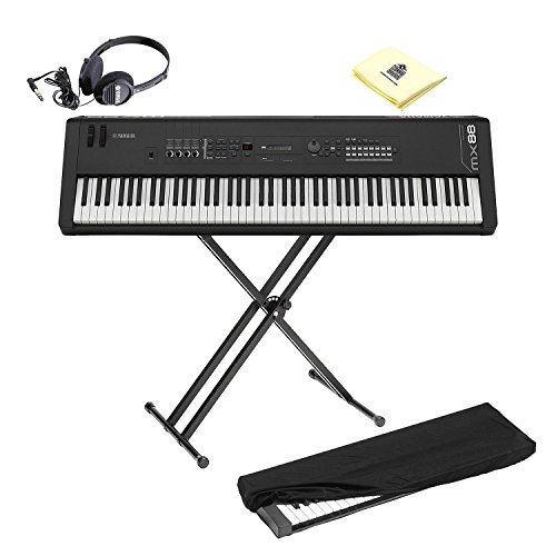The Yamaha MX88 rocks more than 1,000 killer MOTIF XS sounds, a class-compliant USB audio/MIDI interface, and deep controller integration with your favorite computer music software. Its 88 keys are full-sized, weighted, and velocity sensitive. Matte black keytops absorb moisture and remain tactile after extended use. Bring this synth/controller to the studio or a gig and deploy its potent patch arsenal. From amazing acoustic pianos, EPs, strings, and drums to evolving 8-element synth textures, the MX puts it all right at your fingertips.In addition to a massive MOTIF XS soundbank, MX88 is equipped with Yamaha’s VCM FX engine, which meticulously models vintage effects at the circuit level. EQs, phasers, flangers, wah-wahs, and more are all on the menu here, letting you instantly tap into the coveted sounds of the 1970s.Your MX88 is 16-part multitimbral and spec’d with 128-note polyphony.These features build up dense sequences and play them without fear of dreaded note-stealing or sounds cutting off. This makes the MX an ideal tone generation solution for onstage performance and live playback of MIDI tracks off your DAW.The MX88 comes with template editor software, so you can customize the interface to your preferences. There are advanced integration templates for most popular DAWs, and when used with Cubase, an AI knob lets you control any parameter with the MX’s large rotary encoder simply by mousing over it.Yamaha’s MX series ships with a complete music production software suite that includes Steinberg Cubase AI. Cubase AI gives you 64 MIDI tracks, 48 audio tracks, built-in VST effects, and even notation. product asin is B06XSRMGM8 Bundle Included Yamaha PKBX2 Keyboard Stand , Kaces Keyboard Cover, Yamaha RH1C Stereo Headphone and Synthesizer Cloth.