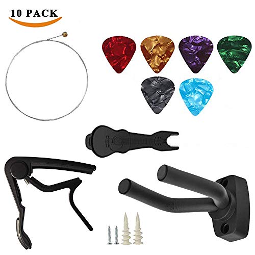 - PACKAGE INCLUDED – 1pc guitar string,6pcs random guitar picks, 1pc guitar capo and 1pc guitar hanger and 1pc guitar string jaw. Very simple tool kit, suitable for most guitar beginners